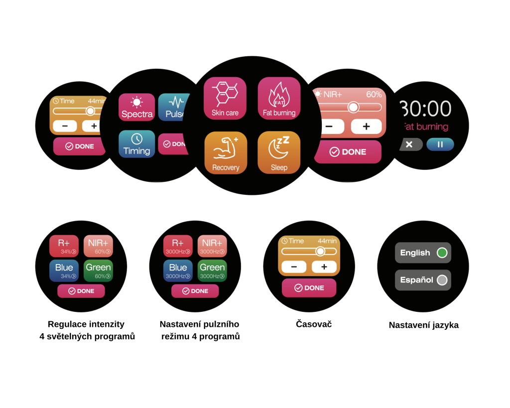 Efektivita: 7 vlnových délek (červené (630 + 660 nm), NIR (810 + 830 + 850 nm), modré (450 nm), zelené (528 nm), 4 programy a 7 přednastavených režimů