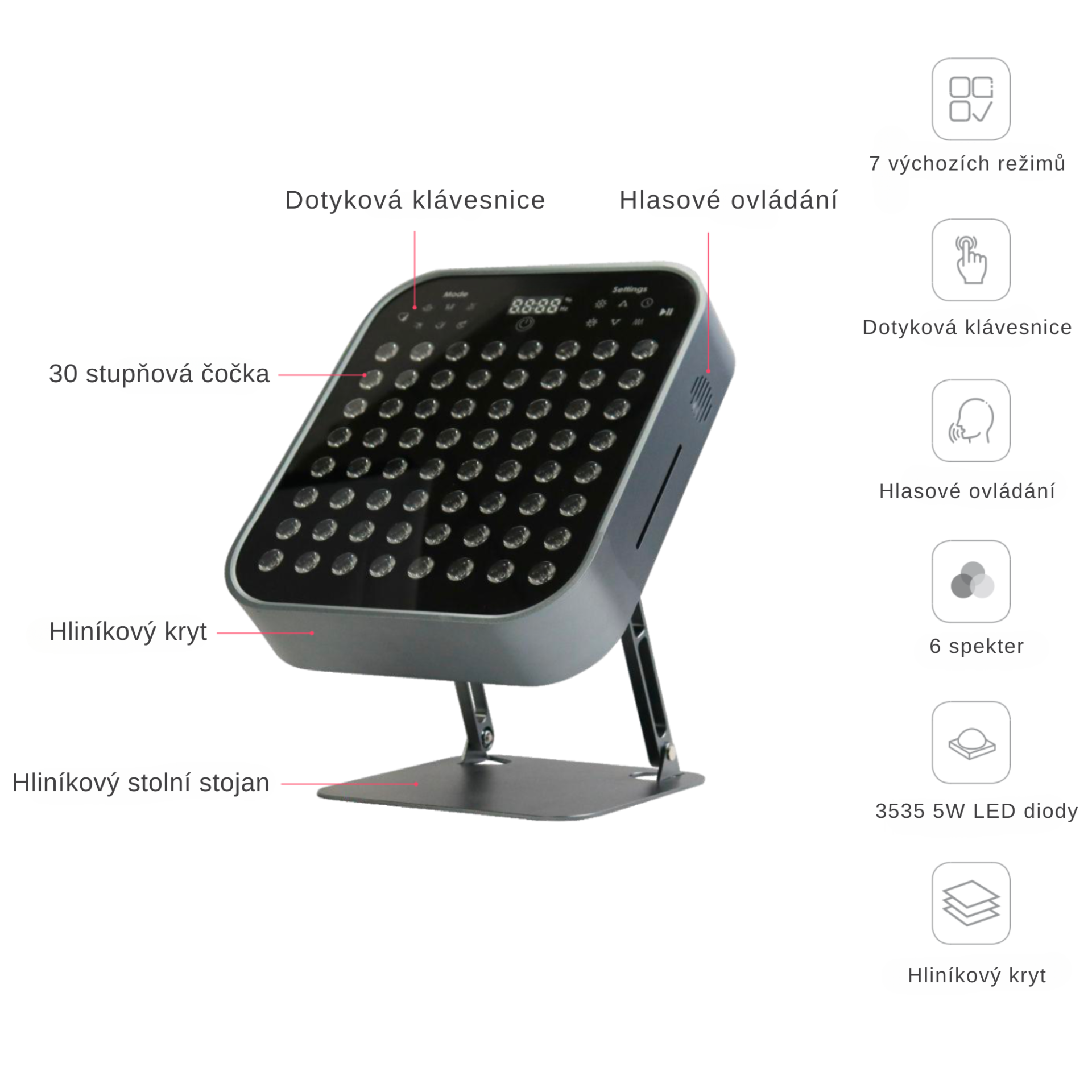 Luxusní stolní lampa pro terapii červeným světlem se 7 vlnovými délkami, elegantním hliníkovým korpusem a stojanem