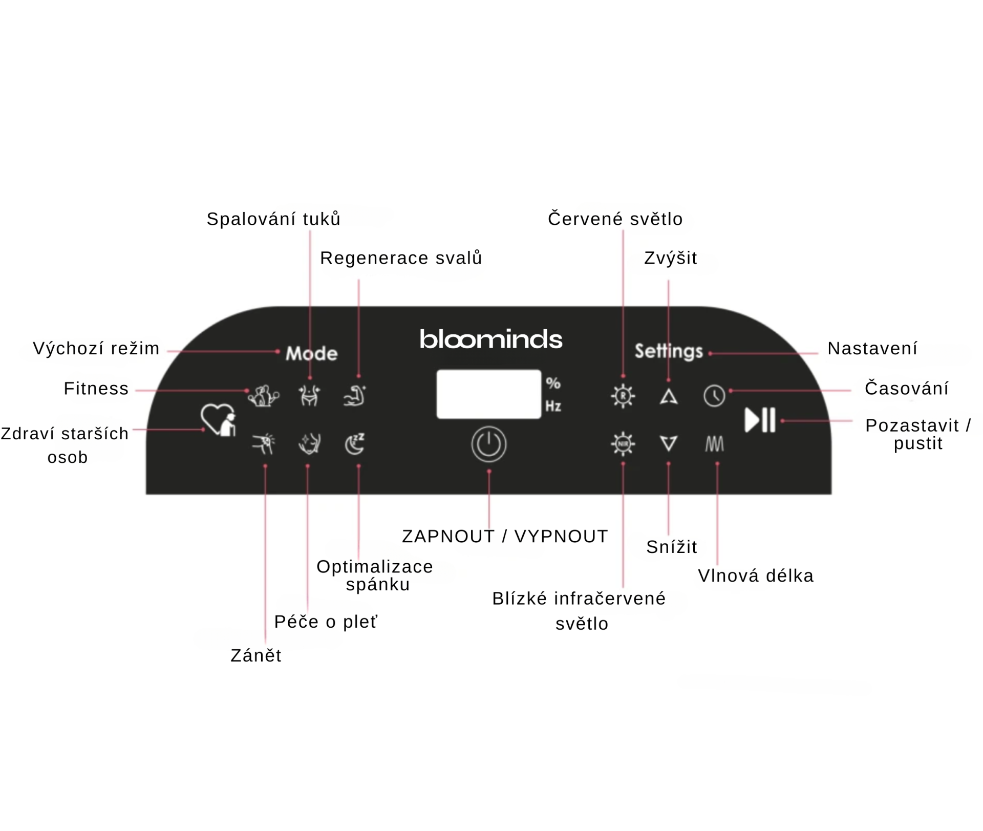 Infra (810–850 nm) – proniká hlouběji, podporuje svaly, klouby a regeneraci.