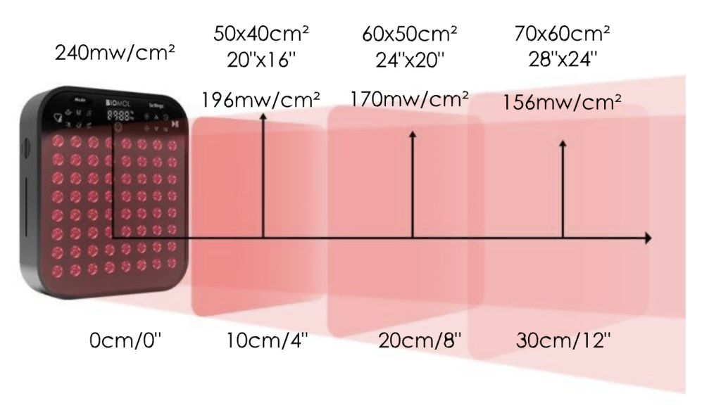 Plocha ozáření: cílená i celotělová terapie se stojanem, výkon >240 mW/cm²