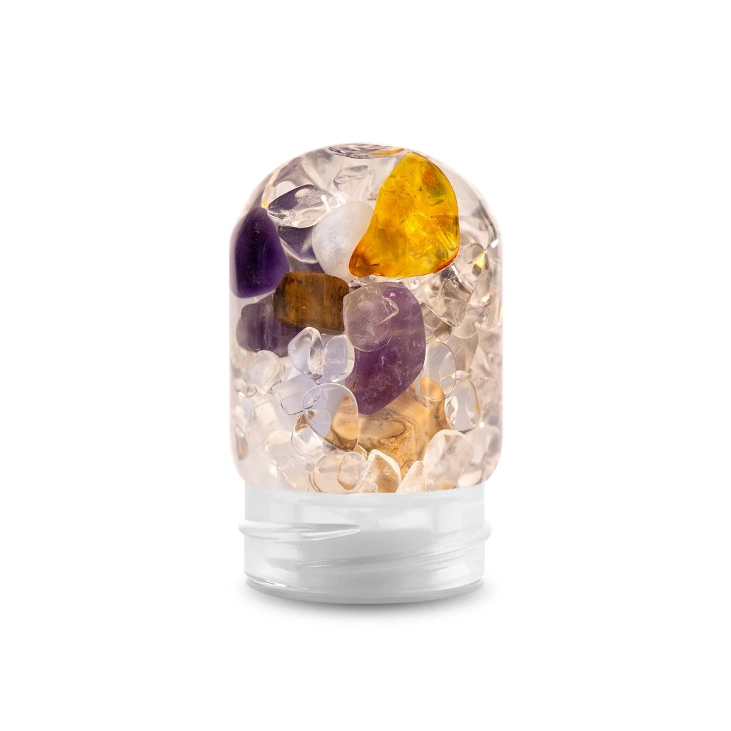 Směs PRANA: Ametyst, zkamenělé dřevo, jantar, chalcedon a křišťál v uzavřeném skleněném modulu.
