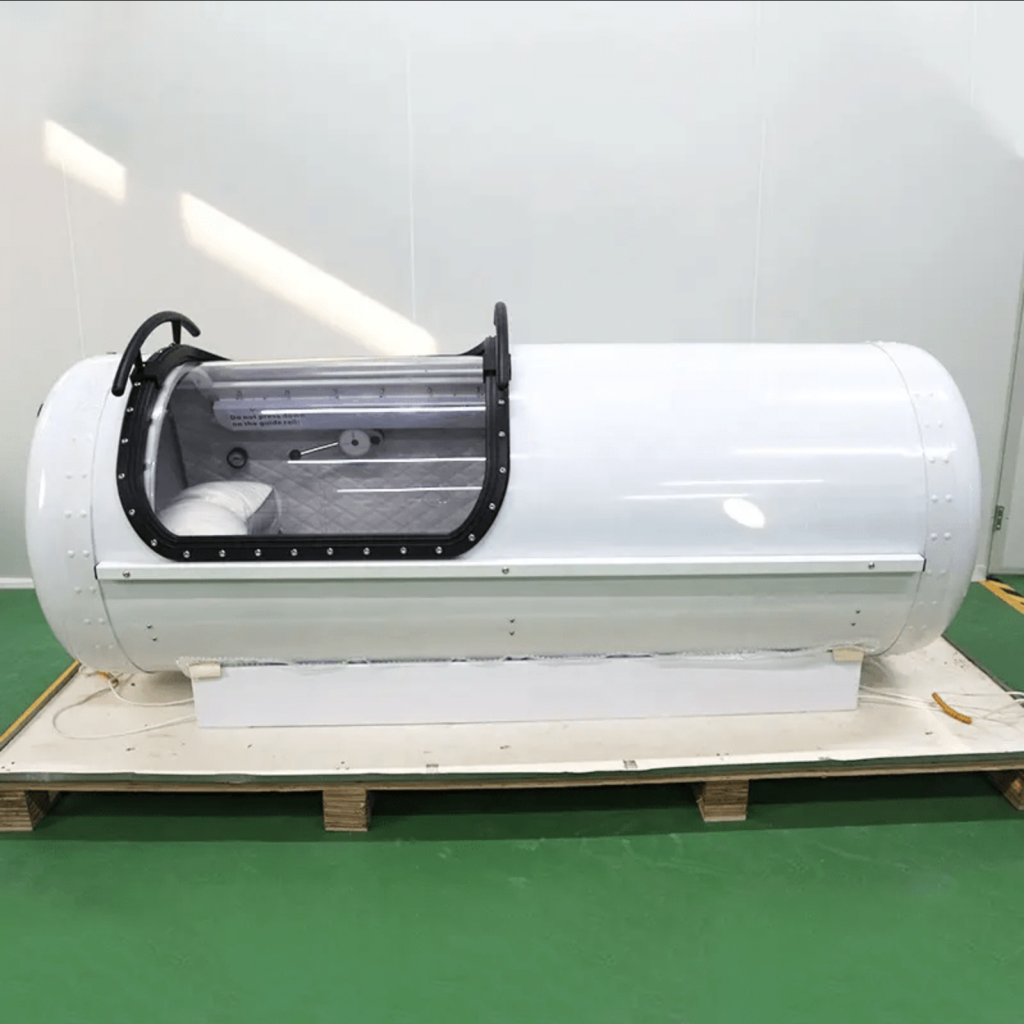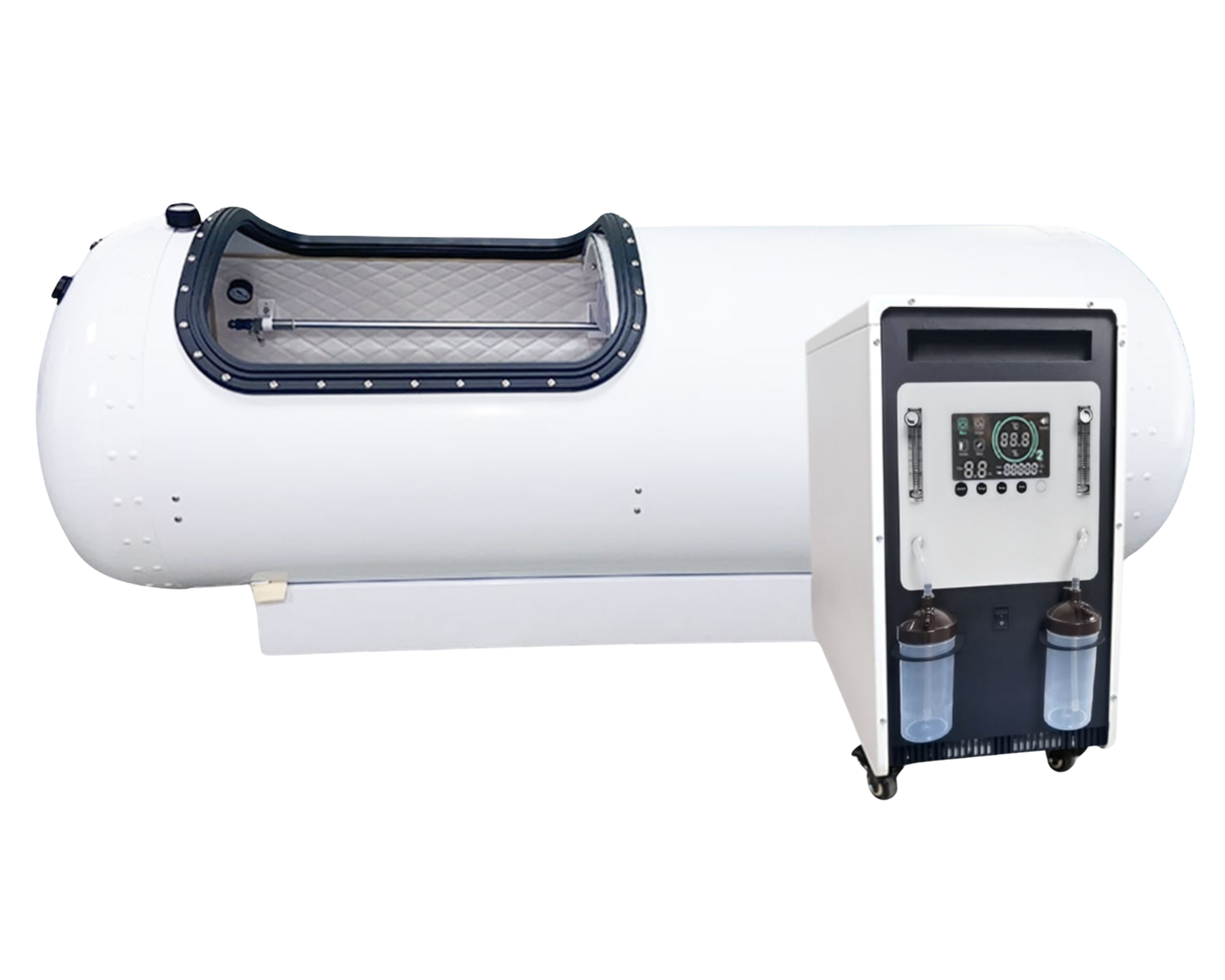 Tlaková komora určená pro hyperbarickou oxygenoterapii ve vodorovné („ležící“) poloze, která vytváří zvýšený tlak pro optimalizované dýchání čistého kyslíku a podporu regenerace těla